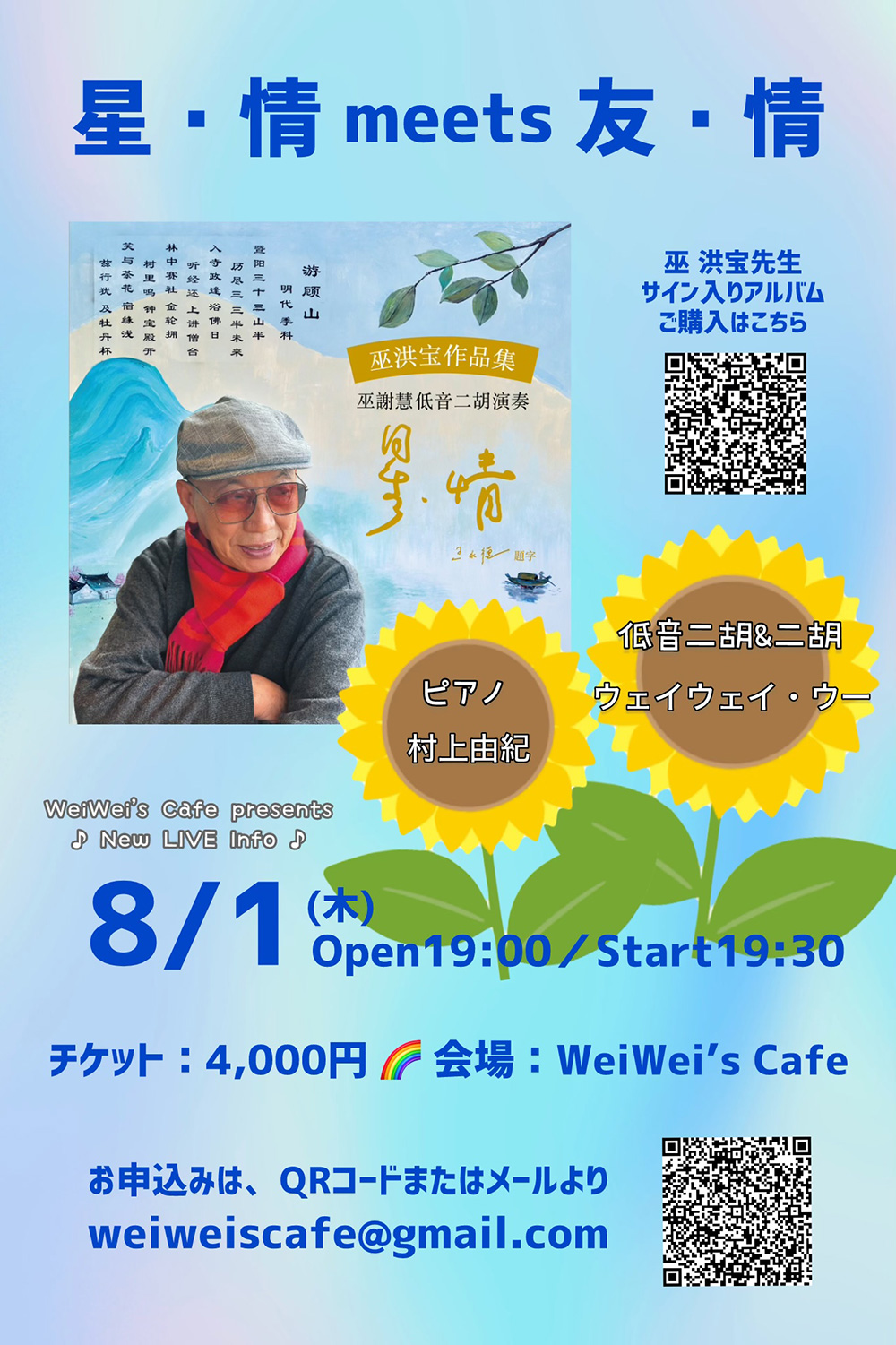 ウェイウェイ・ウーのお父様で作曲家の巫 洪宝先生の作品集『星・情』の楽曲を中心に、低音二胡&二胡meetsキーボードで奏でる楽曲の数々♪