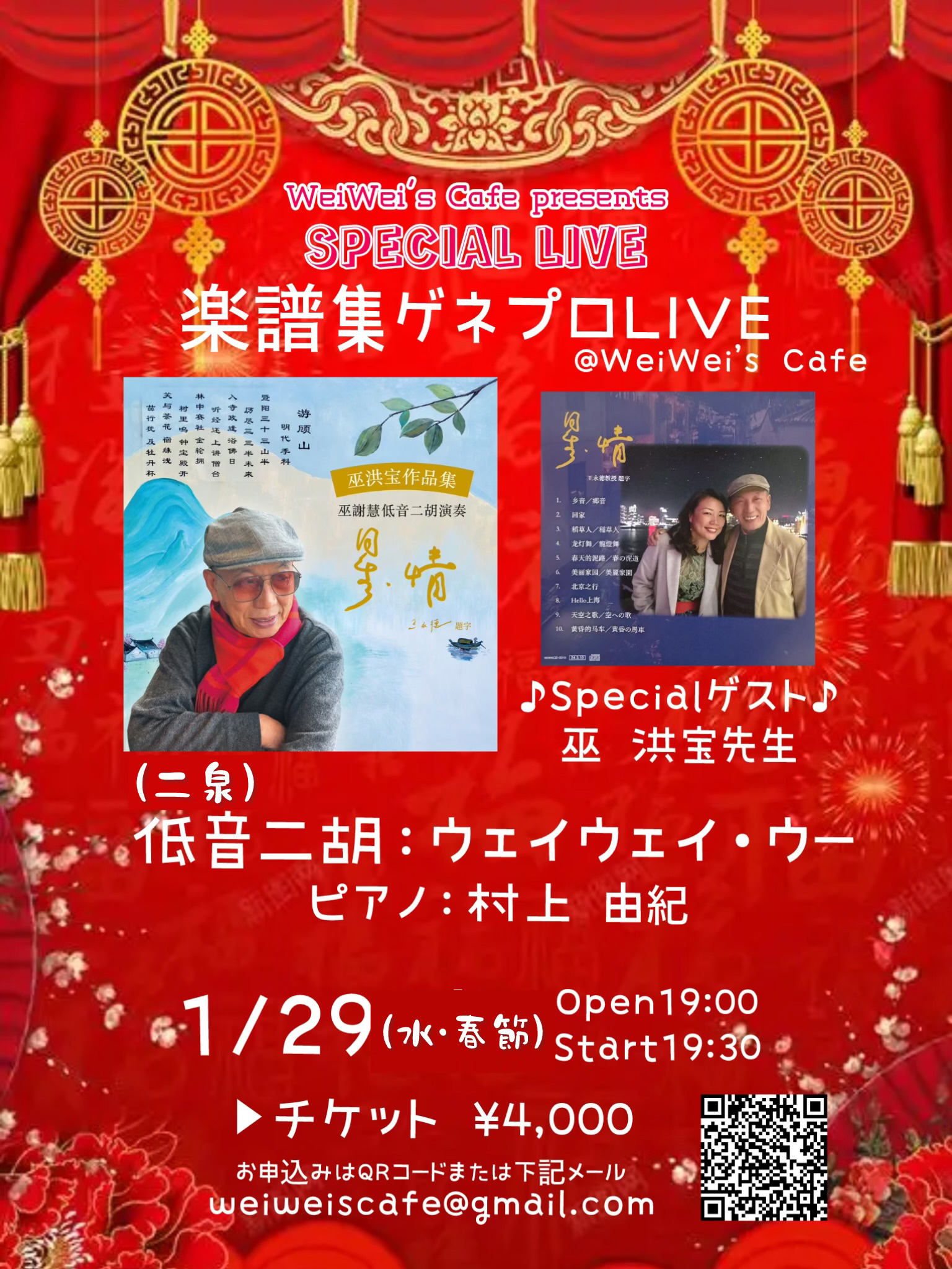 お料理も本番上海料理を提供予定なので、ぜひ東京にいながら中国四千年の歴史を感じられる悠久な低音二胡の音色と共に素敵な春節をお楽しみください!